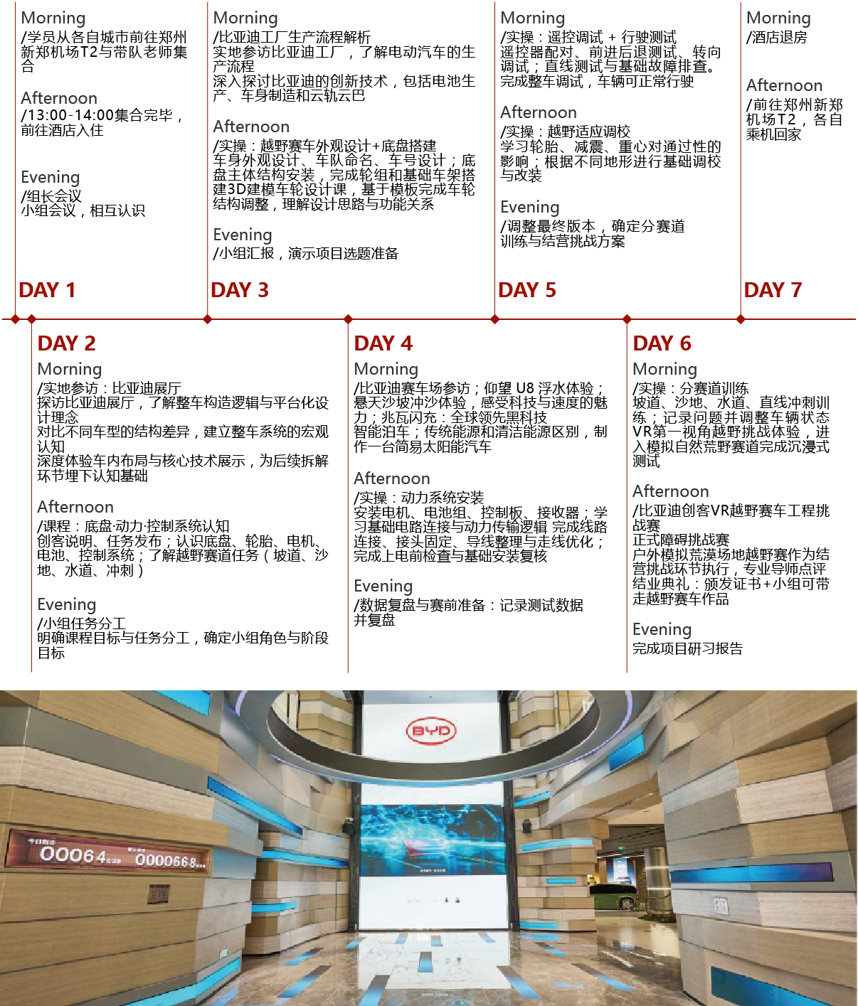 1.新能源汽车核心系统与智造流程学习。 实地参访比亚迪展厅及工厂,了解整车构造与平台化设计理念;学习动力系统结构与原理,亲手拆解电动驱动模块并进行仿真操作;参观自动化生产车间,动手拆装车门、座椅等部件,理解车身结构设计,探秘云轨云巴等前沿技术。 2.硬核工程挑战,从零造车到赛道竞速。 项目学员将围绕一台越野赛车,完成结构搭建、动力安装、线路连接、调试优化全流程,最终参加越野挑战赛,输出测试记录与比赛成果——有作品,有成绩,有成长。