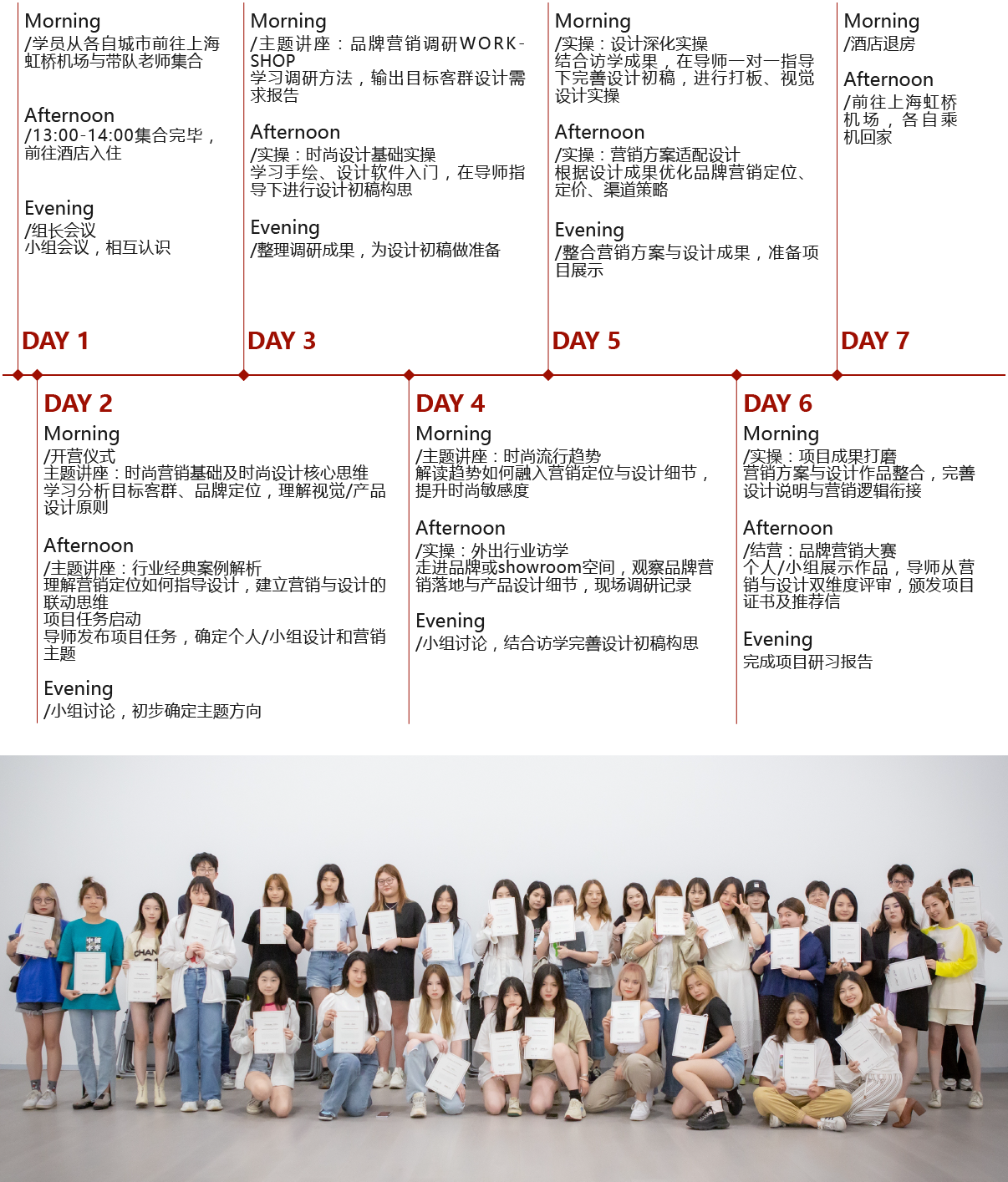 3.行业访学实操, 项目安排半天外出行业访学,学员将走进真实商业场景,观察品牌营销落地与产品设计细节,现场调研记录。访学后,在导师一对一指导下进行设计深化实操,包括打板、视觉设计等,将访学收获转化为创作灵感,完成设计初稿的完善与提升。 4.品牌营销大赛, 学员将以个人/小组形式整合营销方案与设计作品,完成一份完整的时尚小众品牌营销定位方案及配套视觉/产品设计初稿。通过品牌营销大赛,学员将锻炼公众演讲能力与团队协作能力,还能收获专业认可,为背景提升积累高质量实战经历。