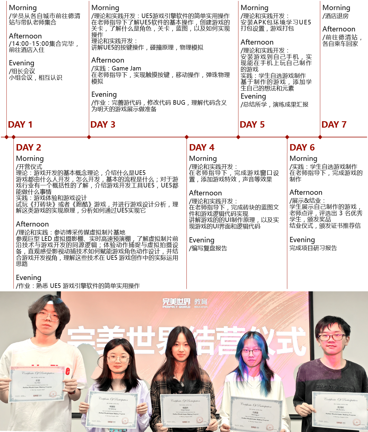 走进完美世界,近距离接触游戏界的游戏策划大咖、完美世界端游首席美术设计师及完美世界主程序员,并由各导师授课,讲解游戏中专业知识。学员不仅可以深入了解游戏策划的内容、在项目中学习运用UE5游戏引擎软件,更可开展GameJam,最终由学员合作完成一款游戏的策划和设计。