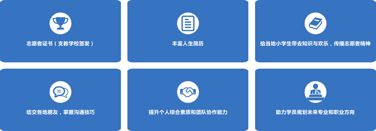 1.日常助学: 参加项目的学员在项目开始之前需要精心的完成教案任务,以保证在项目期间能够按照教案有计划的为孩子们开展助学任务。教案涵盖了早读课、语文、英语等课程助学、才艺助学、作业辅导等任务,完整的体验教师的一天。 2.兴趣课堂: 受交通、经济等因素的影响,山区的教育资源有限,我们将为当地小朋友带去多样化的兴趣活动,例如舞蹈、音乐、心理、科学等。因此学员将以小组为单位进行商讨,充分发挥组员的个人特长开设兴趣课程,为孩子们带来丰富多彩的才艺学习体验。