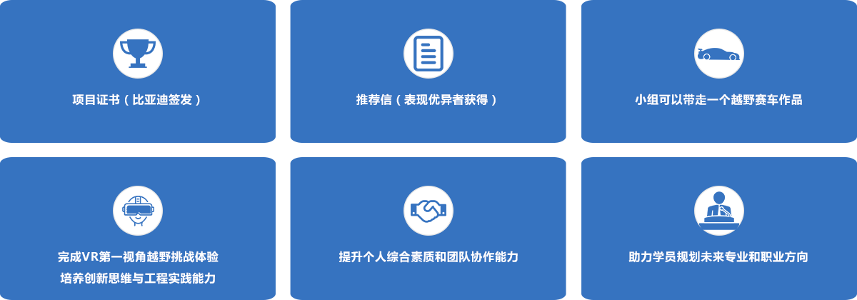 1.新能源汽车核心系统与智造流程学习。 实地参访比亚迪展厅及工厂,了解整车构造与平台化设计理念;学习动力系统结构与原理,亲手拆解电动驱动模块并进行仿真操作;参观自动化生产车间,动手拆装车门、座椅等部件,理解车身结构设计,探秘云轨云巴等前沿技术。 2.硬核工程挑战,从零造车到赛道竞速。 项目学员将围绕一台越野赛车,完成结构搭建、动力安装、线路连接、调试优化全流程,最终参加越野挑战赛,输出测试记录与比赛成果——有作品,有成绩,有成长。