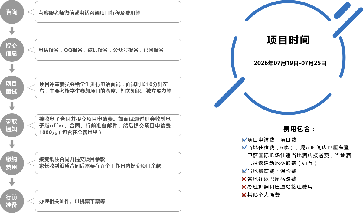 1.日常教学: 参加项目的学员在项目开始之前需要精心地完成教案任务,以保证在项目期间能够按照教案有计划的为孩子们开展教学任务。教案涵盖了语文、数学、英语等课程教学、才艺教学、作业辅导等任务,完整的体验教师的一天。 2.手工制作蜡染: 蜡染是古代印尼的一种工艺,色彩丰富,设计精致,其历史可追溯到两千年前,巴厘岛的蜡染更是素来闻名于世,融合了地方色彩与风格的多样性,极富艺术价值。我们将会跟随当地人,学习印染技术,制作属于自己的蜡染布。