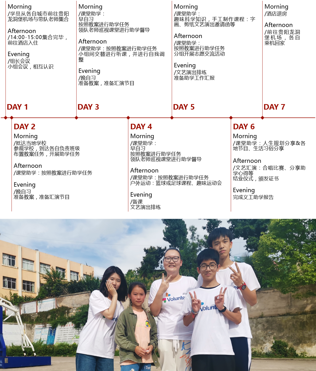 迷人的大山:在中国的西南腹地,有一片神奇的土地——贵州,那里的山、水、林、洞,天然生就,原始古朴,回归自然只需置身其中。贵州的山,层峦叠嶂,喀斯特溶洞遍布全省各地,可谓“无山不洞,无洞不奇”;贵州的水,蜿蜒于深峡幽谷,给这个山区省份增添了几分妩媚。教育现状:与其得天独厚的自然景观形成鲜明的对比,山区的孩子们对山外的世界充满了期望......我们将前往当地学校进行志愿助学,并进行文化交流及体验。 我们将为孩子们带去知识,生活常识等,在当地小学开展交流活动,拓展孩子们的视野,让孩子有更多阅读和了解外面世界的机会;给孩子们举办故事会,为他们描绘外面精彩的大千世界;陪伴他们做游戏、进行趣味运动会等,给他们的生活增添更多色彩。