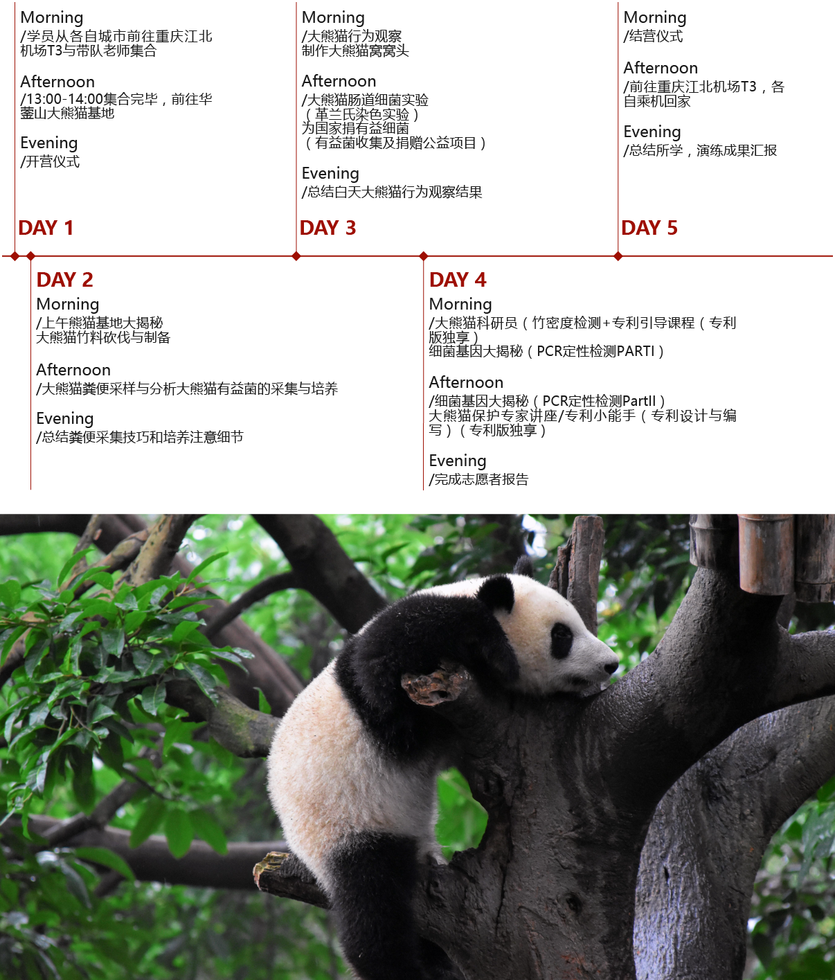 学员们将深入熊猫保护的三大核心领域—— “大熊猫繁育、大熊猫疾病和大熊猫野化放归”:深入野外竹林辨识竹类,检测竹密度、砍伐制备竹料,严格按照科学配方亲手制作熊猫窝窝头;同时参与粪便分析、行为观察,接触大熊猫疾病防控前沿研究,亲手操作PCR仪分析熊猫的肠道菌群,每位参与学员均可参与专利选择,开启一场难忘的大熊猫保育与科研启蒙之旅。